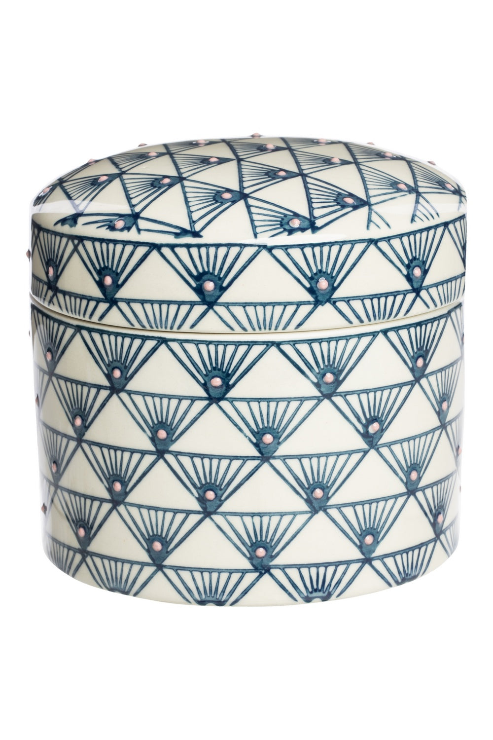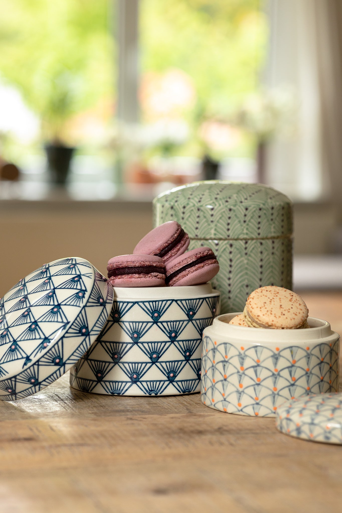 Frische Muster in der Küche gibt es bei unserer Aufbewahrungsdose aus handgestempeltem Steinzeug. Du kannst alle möglichen Inhalte stilvoll und schützend in unseren Dosen verstauen und sie wunderbar in der Küche, im Badezimmer oder in deinem Wohnzimmer als Hingucker dekorieren.