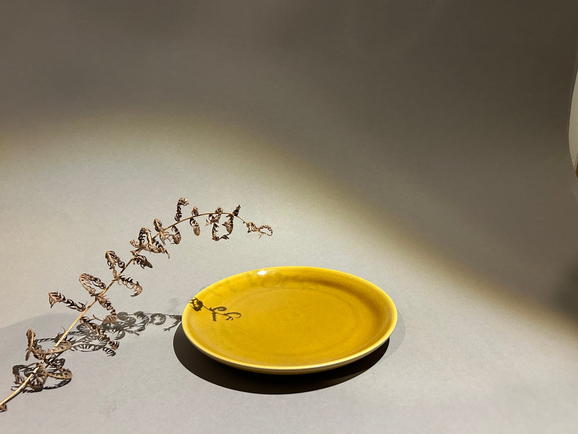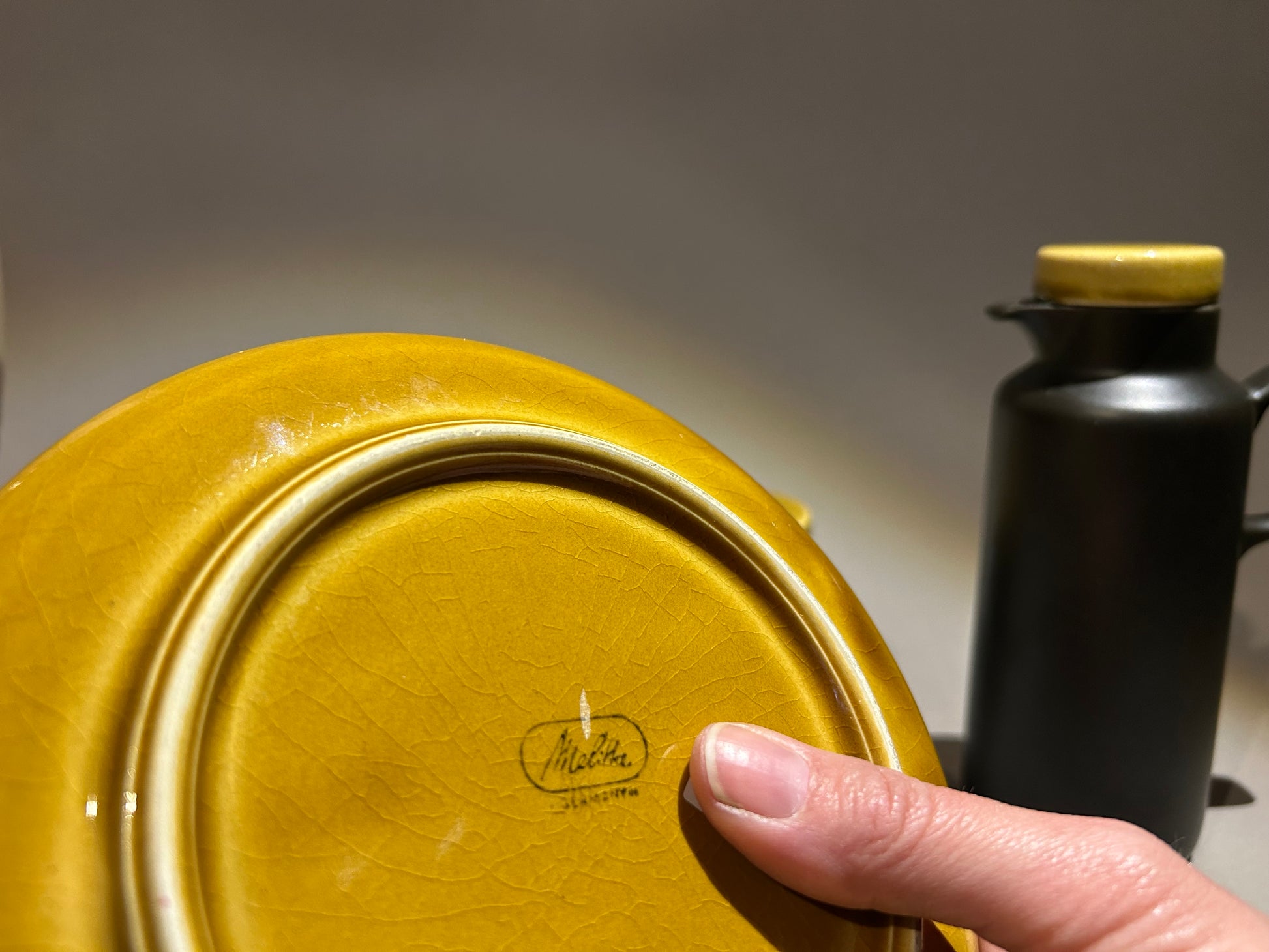 Kleiner Teller der Firma Melitta. Die Senf gelbe Serie gehört zu der Klassiker Linie Kopenhagen. Design von Lilo Kantner. Der Teller weißt ein leichtes Krakelee Muster auf.