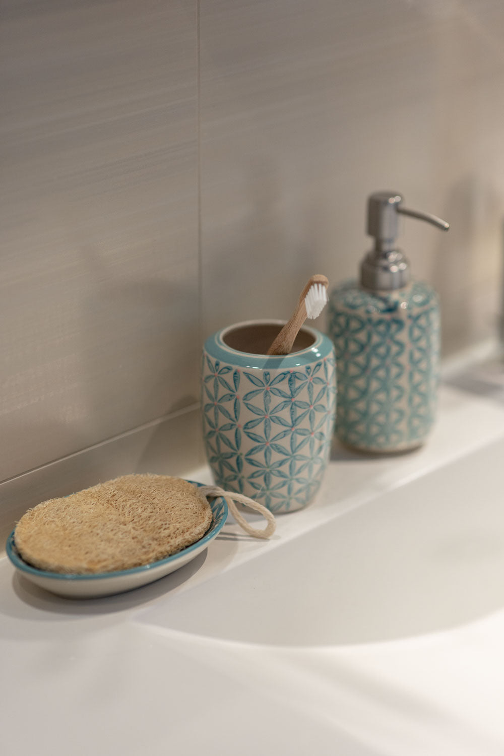 Passend zu dieser Seifenschale gibt es auch eine Ablage, einen Zahnbürstenhalter und eine Dose im Sortiment.